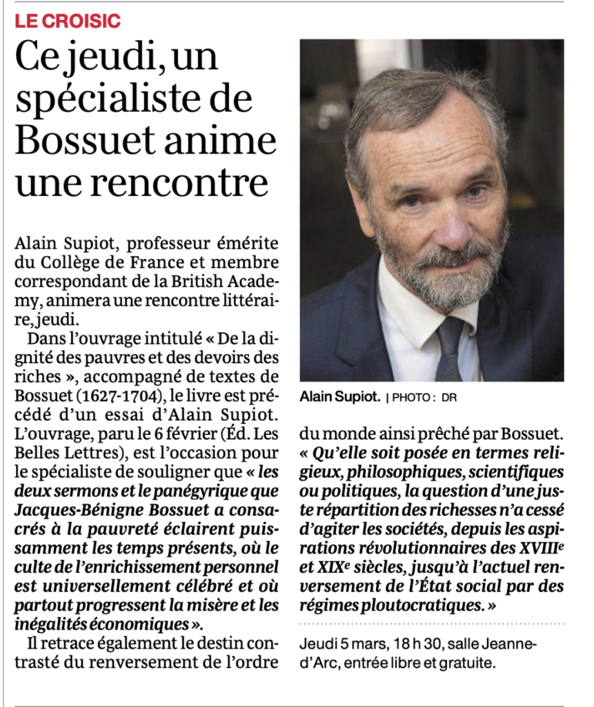 Alain Supiot rencontre ce jeudi 5 mars ses lecteurs au Croisic